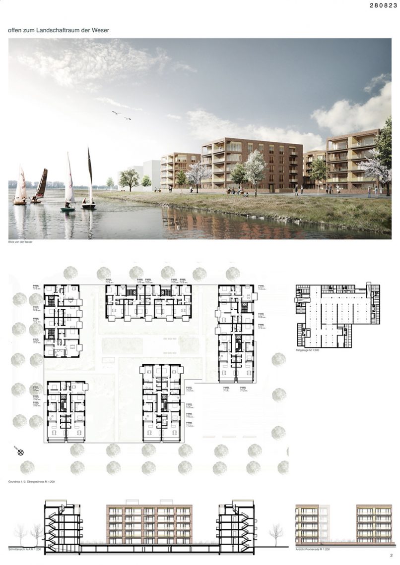 Die Wohnungen im Erdgeschoss des Ensembles erfahren durch großzügige der Straße abgewandte private Gartenbereiche und Terrassen eine Aufwertung. Im vierten Obergeschoss gewinnen die Wohnungen eine besondere Qualität durch Dachterrassen und die vier kleinen Dachaufbauten. Alle anderen Wohnungen haben großzügige Balkone/Loggien vorwiegend mit Süd- und West -Ausrichtung sowie größtenteils Blick in den Landschaftsraum der Weser.