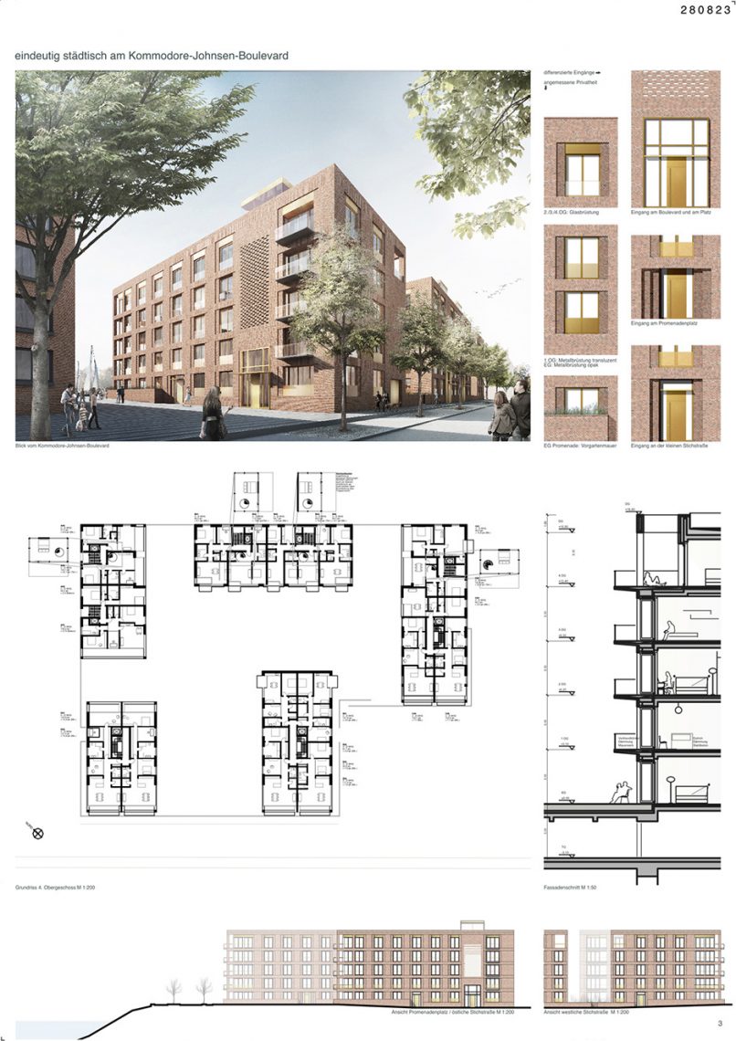 Es gibt sieben identitätsstiftende Eingänge, die sich in Maßstab und Anmutung an dem jeweiligen Platz- oder Straßenraum orientieren, an dem Sie sich befinden.